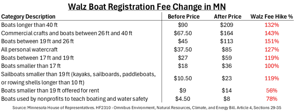 119% Walz fee hike on boats between 17-19 feet: For boats between 17 and 19 feet, Walz more than doubled the fee from $27 to $59.